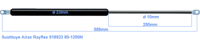 Repuesto para Airax Rayflex 518523 80-1250 Newton. Accesorio de montaje en el tubo: El ojal tiene un grosor de 5mm y un agujero de diámetro 8.1mm. Accesorio de montaje en la varilla: El ojal tiene un grosor de 10mm y un agujero de diámetro 8.1mm. Marca: HAHN, a Stabilus company.