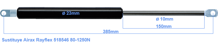Repuesto para Airax Rayflex 518546 80-1250 Newton. Accesorio de montaje en el tubo: El ojal tiene un grosor de 5mm y un agujero de diámetro 8.1mm. Accesorio de montaje en la varilla: El ojal tiene un grosor de 10mm y un agujero de diámetro 8.1mm. Marca: HAHN, a Stabilus company.