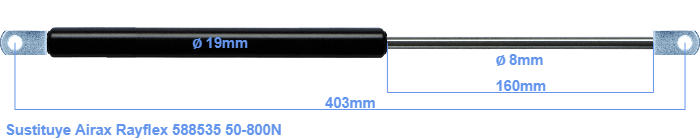 Repuesto para Airax Rayflex 588535 50-800 Newton. El ojal tiene un grosor de 10mm y un agujero de diámetro 8.1mm. Marca: HAHN, a Stabilus company.
