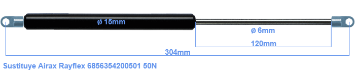 Repuesto para Airax Rayflex 6856354200501 50 Newton. El ojal tiene un grosor de 3mm y un agujero de diámetro 6.1mm. Marca: HAHN, a Stabilus company.