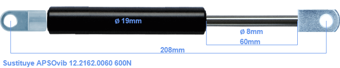Repuesto para APSOvib 12.2162.0060 600 Newton. Accesorio de montaje en el tubo: El ojal tiene un grosor de 5mm y un agujero de diámetro 8.1mm. Accesorio de montaje en la varilla: El ojal tiene un grosor de 10mm y un agujero de diámetro 8.1mm. Marca: HAHN, a Stabilus company.
