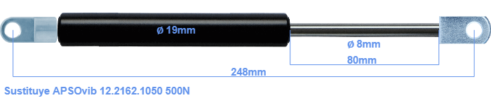 Repuesto para APSOvib 12.2162.1050 500 Newton. Accesorio de montaje en el tubo: El ojal tiene un grosor de 5mm y un agujero de diámetro 8.1mm. Accesorio de montaje en la varilla: El ojal tiene un grosor de 10mm y un agujero de diámetro 8.1mm. Marca: HAHN, a Stabilus company.