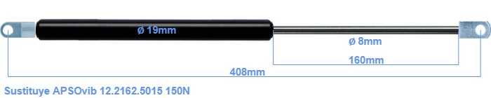 Repuesto para APSOvib 12.2162.5015 150 Newton. Accesorio de montaje en el tubo: El ojal tiene un grosor de 5mm y un agujero de diámetro 8.1mm. Accesorio de montaje en la varilla: El ojal tiene un grosor de 10mm y un agujero de diámetro 8.1mm. Marca: HAHN, a Stabilus company.
