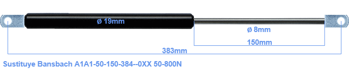 Repuesto para Bansbach A1A1-50-150-384--0XX 50-800 Newton. El ojal tiene un grosor de 10mm y un agujero de diámetro 8.1mm. Marca: HAHN, a Stabilus company.