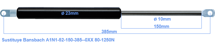 Repuesto para Bansbach A1N1-52-150-385--0XX 80-1250 Newton. Accesorio de montaje en el tubo: El ojal tiene un grosor de 5mm y un agujero de diámetro 8.1mm. Accesorio de montaje en la varilla: El ojal tiene un grosor de 10mm y un agujero de diámetro 8.1mm. Marca: HAHN, a Stabilus company.