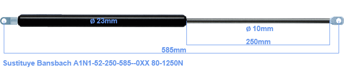 Repuesto para Bansbach A1N1-52-250-585--0XX 80-1250 Newton. Accesorio de montaje en el tubo: El ojal tiene un grosor de 5mm y un agujero de diámetro 8.1mm. Accesorio de montaje en la varilla: El ojal tiene un grosor de 10mm y un agujero de diámetro 8.1mm. Marca: HAHN, a Stabilus company.