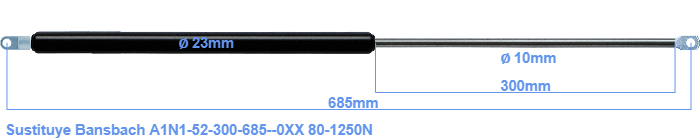 Repuesto para Bansbach A1N1-52-300-685--0XX 80-1250 Newton. Accesorio de montaje en el tubo: El ojal tiene un grosor de 5mm y un agujero de diámetro 8.1mm. Accesorio de montaje en la varilla: El ojal tiene un grosor de 10mm y un agujero de diámetro 8.1mm. Marca: HAHN, a Stabilus company.