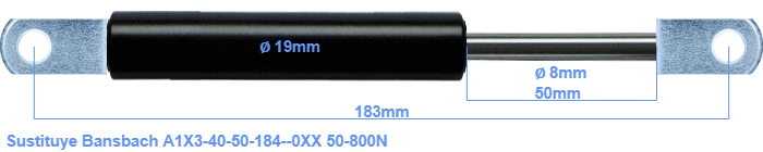 Repuesto para Bansbach A1X3-40-50-184--0XX 50-800 Newton. El ojal tiene un grosor de 10mm y un agujero de diámetro 8.1mm. Marca: HAHN, a Stabilus company.