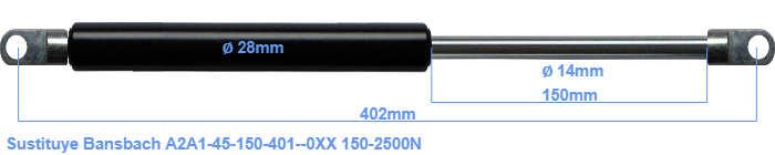 Repuesto para Bansbach A2A1-45-150-401--0XX 150-2500 Newton. El ojal tiene un grosor de 10mm y un agujero de diámetro 8.1mm. Marca: HAHN, a Stabilus company.