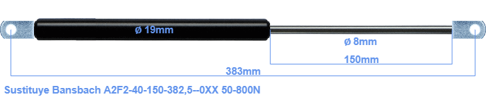 Repuesto para Bansbach A2F2-40-150-382,5--0XX 50-800 Newton. El ojal tiene un grosor de 10mm y un agujero de diámetro 8.1mm. Marca: HAHN, a Stabilus company.