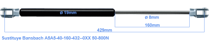 Repuesto para Bansbach A5A5-40-160-432--0XX 50-800 Newton. La horquilla tiene un agujero de diámetro 8.1mm. Marca: HAHN, a Stabilus company.