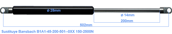 Repuesto para Bansbach B1A1-45-200-501--0XX 150-2500 Newton. El ojal tiene un grosor de 10mm y un agujero de diámetro 8.1mm. Marca: HAHN, a Stabilus company.