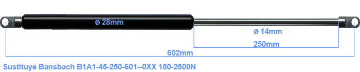 Repuesto para Bansbach B1A1-45-250-601--0XX 150-2500 Newton. El ojal tiene un grosor de 10mm y un agujero de diámetro 8.1mm. Marca: HAHN, a Stabilus company.