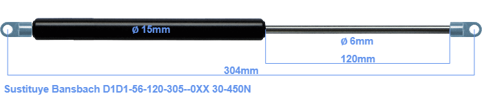 Repuesto para Bansbach D1D1-56-120-305--0XX 30-450 Newton. El ojal tiene un grosor de 3mm y un agujero de diámetro 6.1mm. Marca: HAHN, a Stabilus company.
