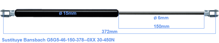 Repuesto para Bansbach G5G5-46-150-378--0XX 30-450 Newton. La horquilla tiene un agujero de diámetro 5.1mm. Marca: HAHN, a Stabilus company.