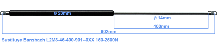Repuesto para Bansbach L2M3-45-400-901--0XX 150-2500 Newton. El ojal tiene un grosor de 10mm y un agujero de diámetro 10.1mm. Marca: HAHN, a Stabilus company.