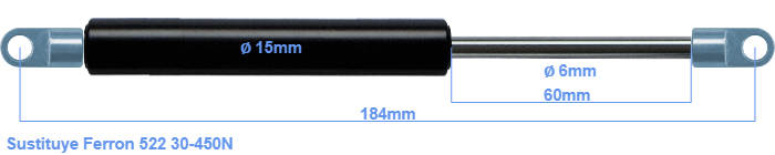 Repuesto para Ferron 522 30-450 Newton. El ojal tiene un grosor de 3mm y un agujero de diámetro 6.1mm. Marca: HAHN, a Stabilus company.