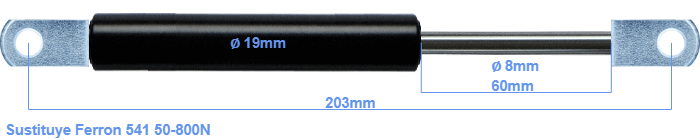 Repuesto para Ferron 541 50-800 Newton. El ojal tiene un grosor de 10mm y un agujero de diámetro 8.1mm. Marca: HAHN, a Stabilus company.