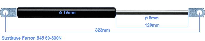 Repuesto para Ferron 545 50-800 Newton. El ojal tiene un grosor de 10mm y un agujero de diámetro 8.1mm. Marca: HAHN, a Stabilus company.