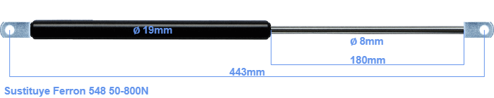 Repuesto para Ferron 548 50-800 Newton. El ojal tiene un grosor de 10mm y un agujero de diámetro 8.1mm. Marca: HAHN, a Stabilus company.