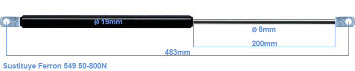 Repuesto para Ferron 549 50-800 Newton. El ojal tiene un grosor de 10mm y un agujero de diámetro 8.1mm. Marca: HAHN, a Stabilus company.