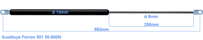 Repuesto para Ferron 551 50-800 Newton. El ojal tiene un grosor de 10mm y un agujero de diámetro 8.1mm. Marca: HAHN, a Stabilus company.