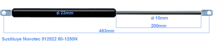 Repuesto para Novotec 512522 80-1250 Newton. El ojal tiene un grosor de 10mm y un agujero de diámetro 8.1mm. Marca: HAHN, a Stabilus company.