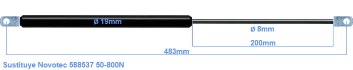Repuesto para Novotec 588537 50-800 Newton. El ojal tiene un grosor de 10mm y un agujero de diámetro 8.1mm. Marca: HAHN, a Stabilus company.