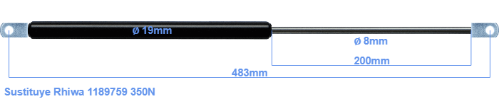 Repuesto para Rhiwa 1189759 350 Newton. El ojal tiene un grosor de 10mm y un agujero de diámetro 8.1mm. Marca: HAHN, a Stabilus company.