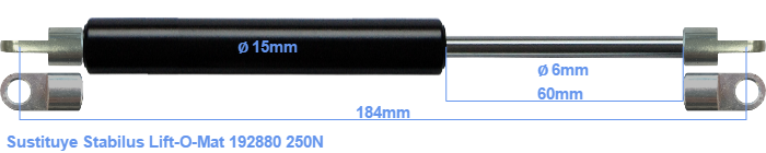 Repuesto para Stabilus Lift-O-Mat 192880 0250N. El ojal tiene un grosor de 3mm y un agujero de diámetro 6.1mm. Marca: HAHN, a Stabilus company.