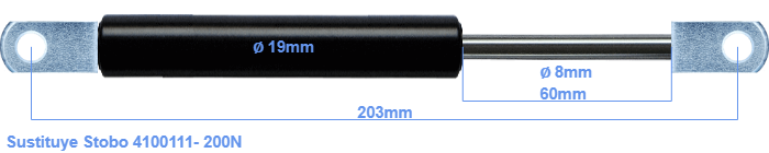 Repuesto para Stobo 4100111- 200 Newton. El ojal tiene un grosor de 10mm y un agujero de diámetro 8.1mm. Marca: HAHN, a Stabilus company.