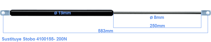 Repuesto para Stobo 4100155- 200 Newton. El ojal tiene un grosor de 10mm y un agujero de diámetro 8.1mm. Marca: HAHN, a Stabilus company.