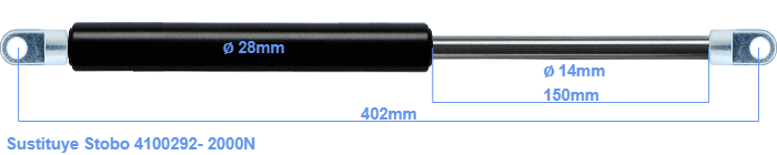Repuesto para Stobo 4100292- 2000 Newton. El ojal tiene un grosor de 10mm y un agujero de diámetro 10.1mm. Marca: HAHN, a Stabilus company.