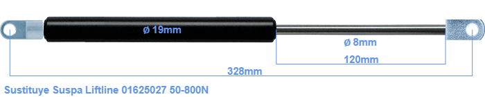Repuesto para Suspa Liftline 01625027 50-800 Newton. Accesorio de montaje en el tubo: El ojal tiene un grosor de 5mm y un agujero de diámetro 8.1mm. Accesorio de montaje en la varilla: El ojal tiene un grosor de 10mm y un agujero de diámetro 8.1mm. Marca: HAHN, a Stabilus company.