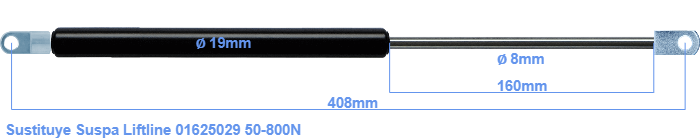 Repuesto para Suspa Liftline 01625029 50-800 Newton. Accesorio de montaje en el tubo: El ojal tiene un grosor de 5mm y un agujero de diámetro 8.1mm. Accesorio de montaje en la varilla: El ojal tiene un grosor de 10mm y un agujero de diámetro 8.1mm. Marca: HAHN, a Stabilus company.