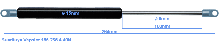 Repuesto para Vapsint 156.265.4 40 Newton. El ojal tiene un grosor de 3mm y un agujero de diámetro 6.1mm. Marca: HAHN, a Stabilus company.
